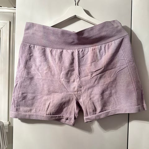 Domyos Slim sykkelshorts for dame i størrelse XS. Shortsen har en tettsittende passform og er i lilla farge med et mønstret design. Materialet er egnet for trening og sportsaktiviteter.