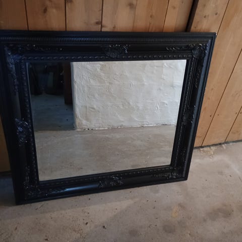 Rektangulært speil med bred, dekorativ ramme i svart. Str. 87x76 cm. Rammen har utskårne detaljer og profilerte kanter som gir et klassisk uttrykk. Passer til bruk i for eksempel gang, stue eller soverom. Kan henges på vegg eller settes opp mot vegg etter behov.