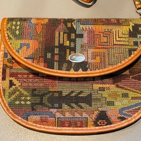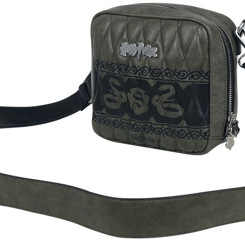Detaljert med gulltrykk, metallhjørner og justerbar skulderrem i skinnimitasjon.