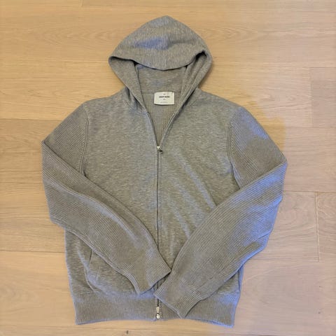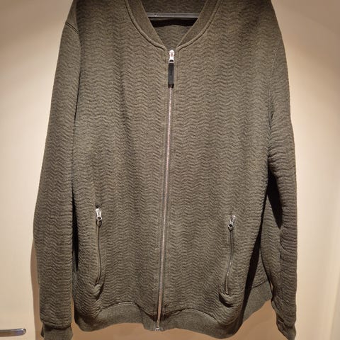 J. Lindeberg herrejakke i størrelse S og grå farge. Jakken har glidelås foran, to glidelåslommer og ribbestrikkede kanter ved hals, ermer og nederkant. Materialet er mykt og har et strukturert mønster på baksiden. Jakken er designet for menn og egnet for hverdagsbruk.