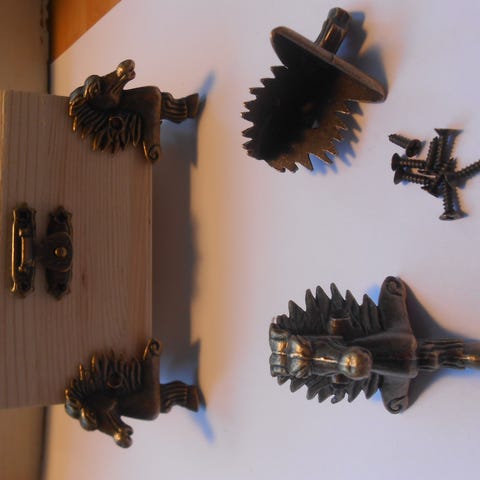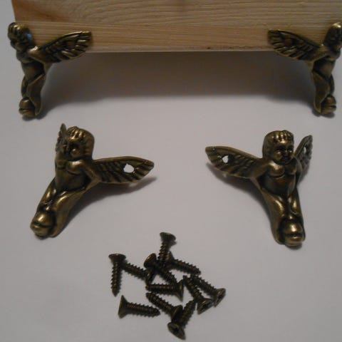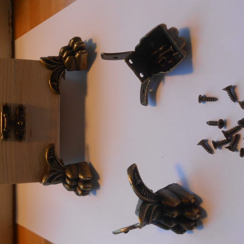 Sett med 4 metall hjørnebeskyttere + skruer med dekorative detaljer. Beskytterne er designet for å festes på hjørnene av bokser, kister eller møbler for å gi ekstra beskyttelse og et dekorativt utseende. Fargen er mørk med antikk finish. Passer for gjenstander som trenger hjørnebeskyttelse /pynt.