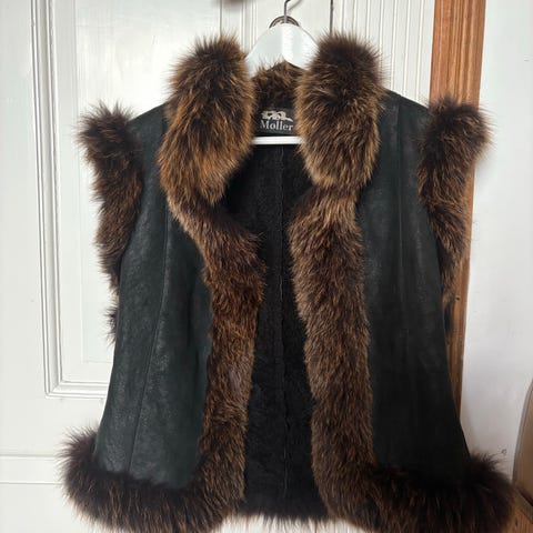 Mørk grå/svart vest med fuskepelskrage og synlige sømmer. Kragen er tofarget i svart og hvitt/grått, og vesten har en åpen front med hekter. Materialet er semsket look i polyester. med fôr som ligner sauepels eller fuskepels på innsiden.