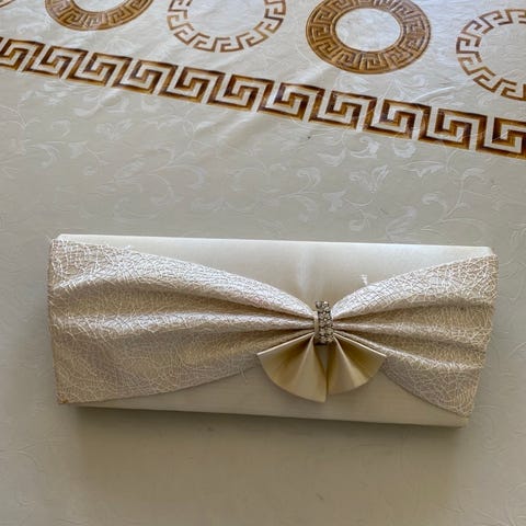 Liten og hvit selskap veske. Nydelig sløyfe pynt på