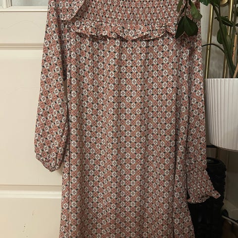 Selger en nydelig kjole fra Lindex i XS. Brukt 1 gang, som ny. Små blomstrete print med volangdetaljer. Fin nå til høsten med boots til. Kan sendes!