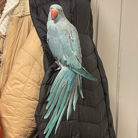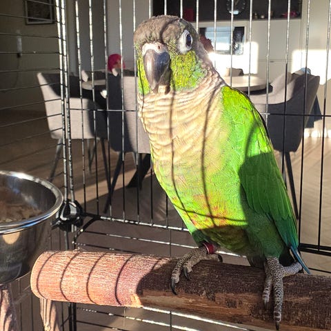 Han er 6 månder gammel og han er veldig rolig og han begynner å snakke litt og han har papir og han har ring i beinet og hvis dere vil ha han med bur så koster han 14300kr
