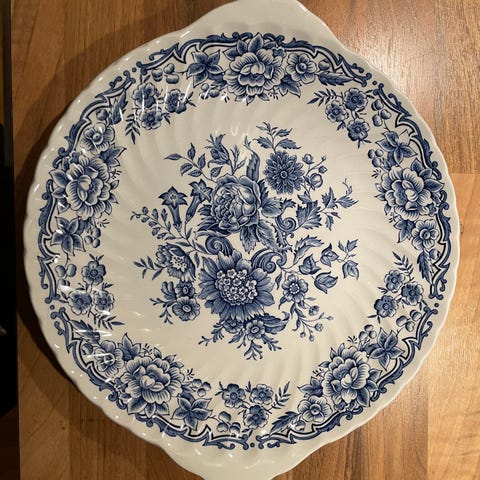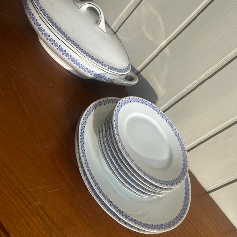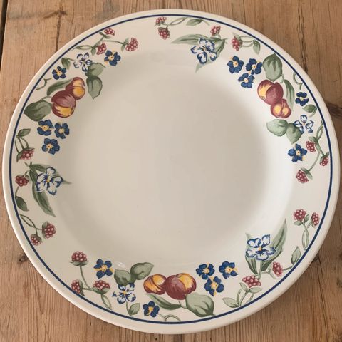 Den ene tallerknene har et avslag i kanten og en svart prikk , men skaden er med glasur. Mulig fra produksjonen. Se egne bilder.