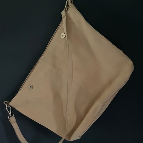 H&M skulderveske i svart lær for dame. Vesken har en justerbar skulderrem og en frontlomme med spenne. Egnet for daglig bruk med et enkelt og funksjonelt design.