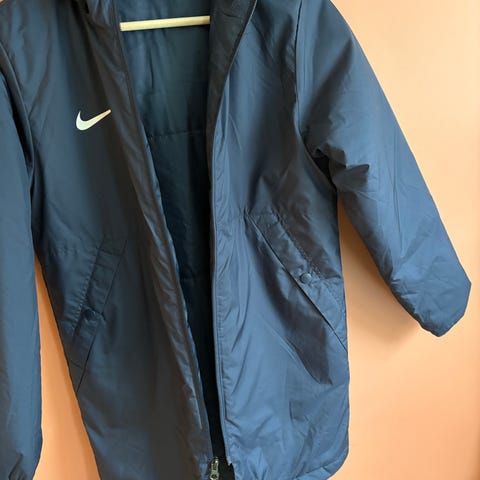 Nike Fotballjakke for barn i størrelse 140. Jakken er svart med grønne detaljer og laget for sportsbruk, spesielt fotball. Den har glidelås foran og er laget av lett materiale med meshfôr for ventilasjon.