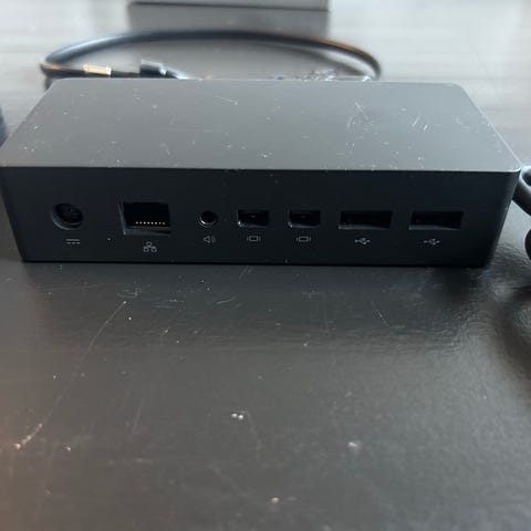 Microsoft Surface Docking/Adapter Strømadapter i svart farge. Adapteren har flere porter for tilkobling og leveres med strømkabel. Egnet for bruk med Microsoft Surface Pro enheter.