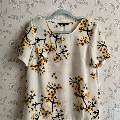 Selger denne sommer blusen med blått mønster. Aldri brukt, bare prøvd en gang! Flowy og kortere bak.