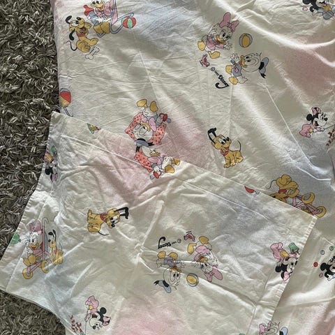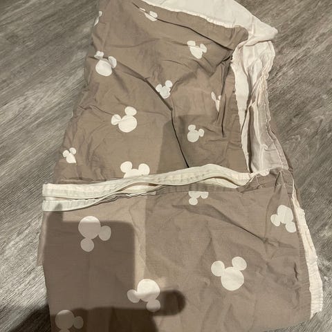 Lystette gardiner med Mikke Mus. Lengde er 160cm, lys rosa. Pent og lite brukt. 2stk lengder