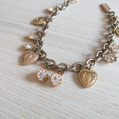The Holy Spirit Bracelet is made of metal, finished with a heart and rhinestones, in gold color.