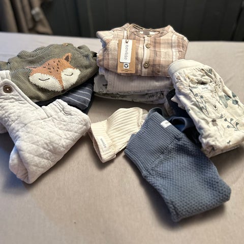 Flere plagg er ubrukt, kun vasket (uten parfyme), ellers er plaggene pent brukt uten skader eller flekker.