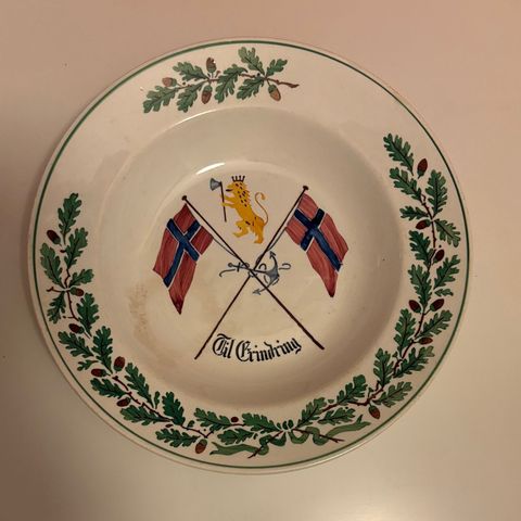 veggtallerken i keramikk med gul og blå fargepalett. Tallerkenen har et mønster med blomster og en fugl, og er egnet for veggdekorasjon. 30 cm i diameter