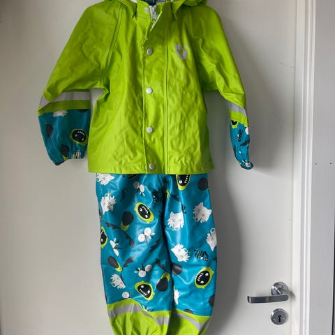 Tøff regnsett for barn i størrelse 104. Bukser, jakke og lue.