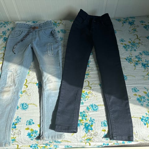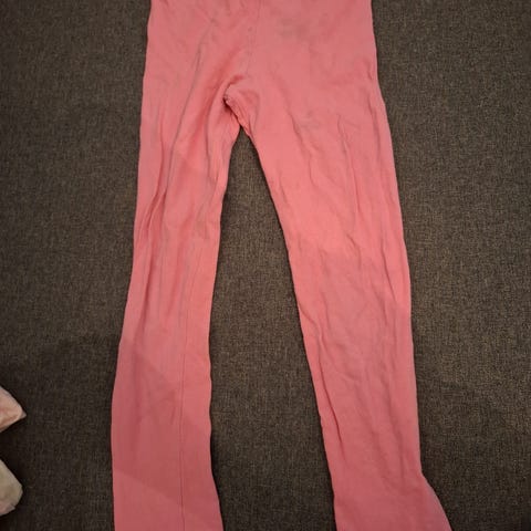 Selger pakke med bukser i størrelse 128. Den rosa buksa er mer elastisk, den turkise er en vanlig olabukse. Den turkise har også en flekk på kneet, men den burde bli vasket vekk etter et vask I vaskemaskinen.