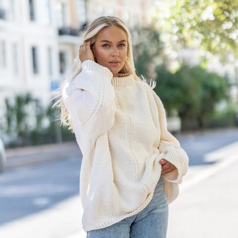 Strikket i garnet gann garn-Cloud (baby alpakka, merino og nylon. Garnet er i fargen natur) litt vidde på ermene.