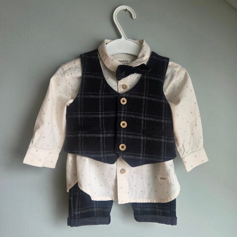 Newbie gutt klær sett i størrelse 68. Settet består av en grå vest og en hvit langermet skjorte med knappelukking ved skulderen. Buksen er rutete i mørke toner. Pent brukt