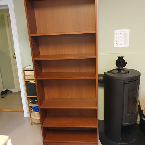 Bokhylle selges pga plassmangel. Noen år gammel, men ingen skader. Bruksmerker kan forekomme, trenger en god vask. Mener den er kjøpt på skeidar eller bohus. Mulig å justere høyden på hyllen inni som ønsket. Må hentes på Stavset