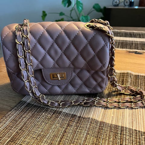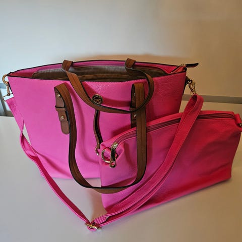 Høyde 35 cm. Bredde 30cm. Farge sort og rosa. Kjøpt i Italia, litt usikker på om det er skinn eller kunstlær.