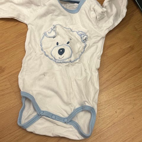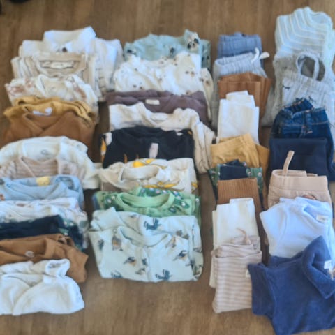 Fin klespakke i str. 62, stripete bukse i str. 56, ellers noen deler i str. 68. Strikkejakke som er str. 68/74 mangler en knapp, ellers ingen flekker og hull. Røykfrie og dyrefri hushold.