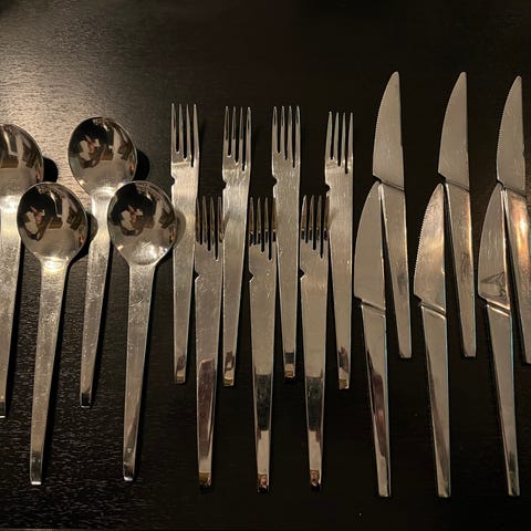 Sett til 6: kniver, skjeer, gafler og teskjeer.