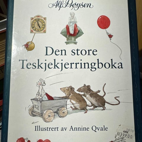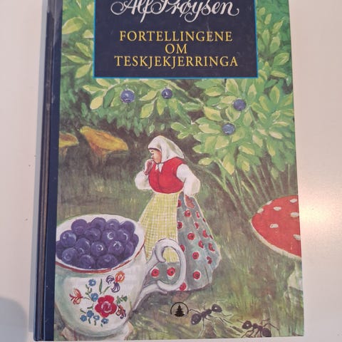 Alf Prøysen Fortellingene om Teskjekjerringa bok med illustrert omslag. Inneholder historier om Teskjekjerringa, skrevet på norsk. Passer for lesere interessert i norsk litteratur og barnebøker.