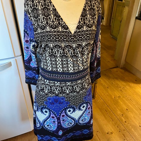 Kaffe kjole i størrelse L Kjolen har et flerfarget abstrakt mønster i lyse og mørke toner. Den har korte ermer og figurnær fasong med rynkedetaljer i sidene. Glatt fôr på innsiden gir behagelig passform. Egnet til både hverdag og fest.