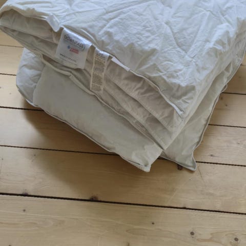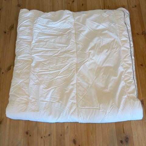 Tror den er ca 180 bred og rundt 2 meter langt. trekket er fra IKEA. lys rosa på ene siden og mørk rosa på andre. 2 stk putevar følger også med.