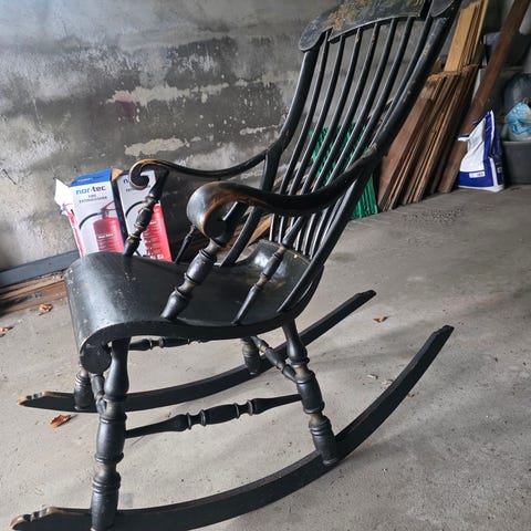 Antikk gyngestol i tre med svart lakkert finish. Stolen er en original seksfoting fra begynnelsen av 1900-tallet med spilerygg og buede armlener. Stolen er i veldig fin stand, kun bruks-slitasje. NY PRIS 1600,-