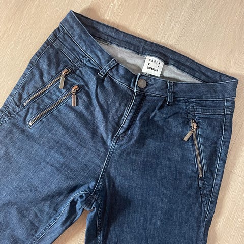 Karen by Simonsen hvite vide jeans. Str 29 livvide (men oppleves store). Innerbenslengde 69cm, livvidde ca 40cm, vidde nederst på bein 30cm. Dekorative brune sømmer, deilig mykt stoff. Pent brukt.