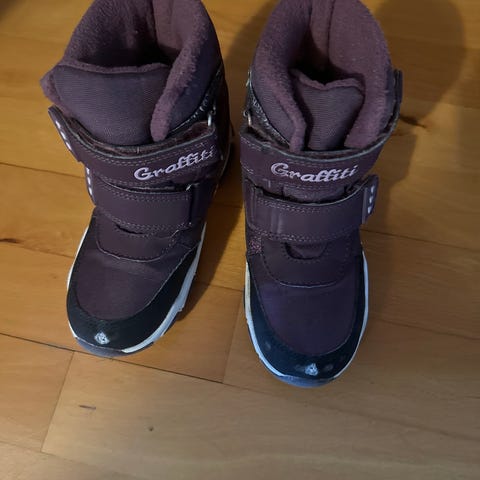 To par vintersko str 27 etter tvillingjenter. Fortsatt gode og varme. Blinkesko. Har slitasje på toppen av skoene grunnet bremsing på huske. Evt brukes som ekstra sko ved behov.