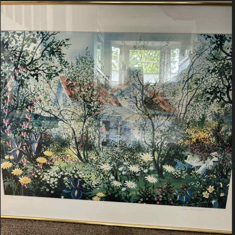 Maleri med blå blomster i gyllen ramme
