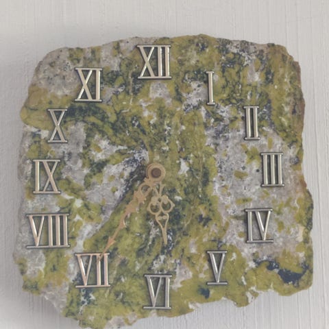 Denne klokken vil dekorere hjemmet eller kontoret ditt og være en unik gave. Designet imiterer en slipt agat. Glatte linjer og kontrastfarger fremheves og mykes opp av innlegg av naturlig bergkrystall, røykkvarts og rosenkvarts. Epoksyharpiks gir glans og fargedybde. Viserne og tallene er speilblanke. Mekanismen er lydløs. Klokken måler 45 cm og kan monteres på veggen. Hvis du har spørsmål, kan du sende en privat melding.