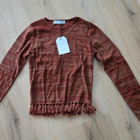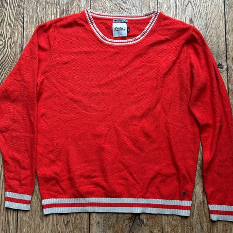Uniqlo genser i størrelse M for kvinner. Genseren er rød med stripemønster og har V-hals. Materialet består av en blanding av ramie, nylon og bomull.