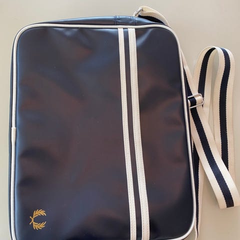 Fred Perry bag selges. Vesken har en rund form med et stort hovedrom og justerbare skulderremmer. Den har et stripete design i blått og hvitt, med Fred Perry-logo på fronten. Kjøpt ny i desember 2024 for 1500kr.