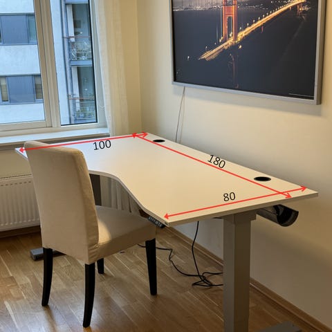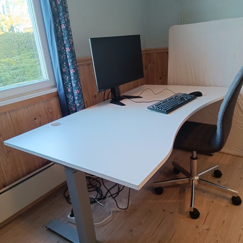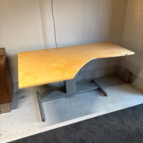 Kinnarps pult 140x90cm med lys grå plate og grå bein i svært god stand. Dette er en ergonomisk kvalitetspult produsert i Sverige.