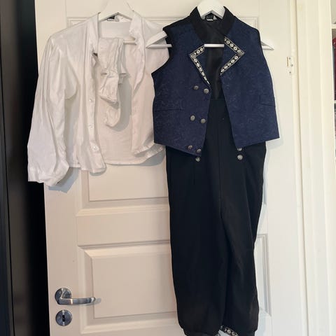 Pent brukt festdrakt bunad til gutt. Følger med bunadscaps, skjorte, vest og selebukse og str 34 i sko. Avtagbar brosje på skoen som kan tas og