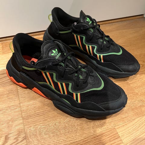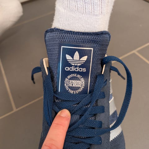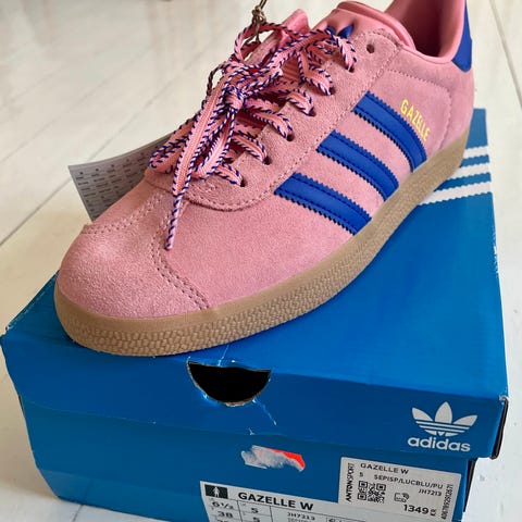 Adidas Gazelle i rosa med svarte striper og blå detaljer