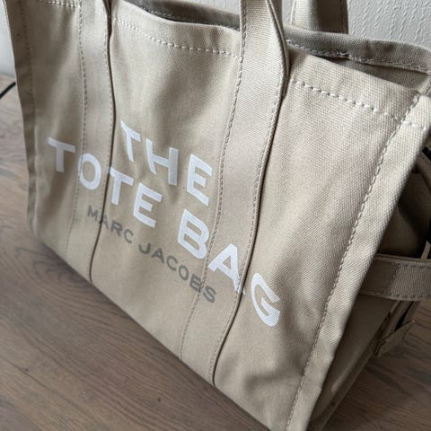 Selger min tote bag fra marc jacobs, strl medium. Vesken er hel og har ingen skader, men har blitt noe grå i stoffet her og der (se bilde). Har ikke forsøkt å vaske vekk, men vil tro det kan fjernes med fuktig klut. Kjøpt for 1 år siden hos Miinto
