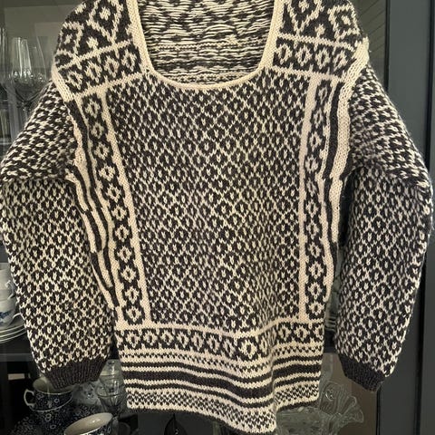 Endelig fikk jeg anledning til å strikke den legendariske Per Spook genseren. Men, den ble liten til meg. Strikket i 100% ull. 90 cm omkrets. Hel lengde 59 cm