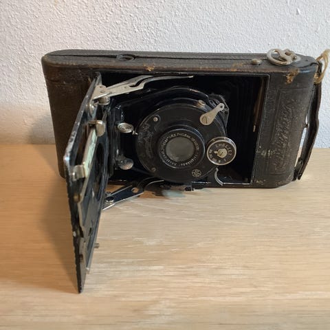 Vintage Kristal Pronto foldekamera frs 30-tallet. Kameraet har en sammenleggbar belyst bellow, mekanisk lukker og manuell fokus og passer til samlere eller fotografer med interesse for vintage utstyr.