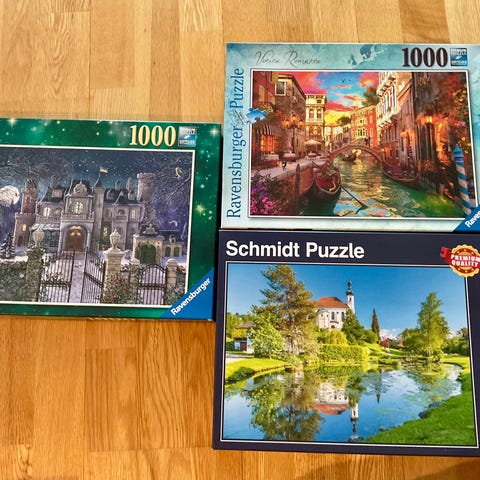 Ravensburger og Jumbo puslespill med 1000 eller 500 brikker hver. Interessert i å bytte til andre puslespill med 500 eller 1000 brikker eller så kan de kjøpes for 100 kr hver.