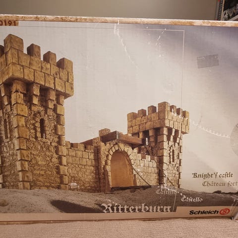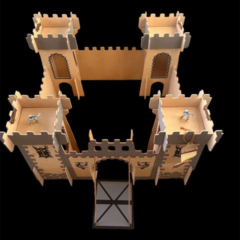 Som ny Ridderslott i grå og rød farge laget av tre. Slottet har flere tårn og porter, med detaljer som vinduer og flagg. Passer som lekesett for barn som liker middelalder- og riddertema.