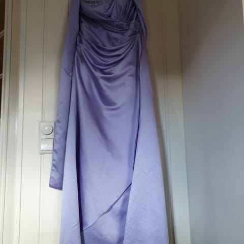 Selger en elegant selskapskjole i lilla med matchende jakke, skjerf, sko og veske. Perfekt til bryllup, fest eller spesielle anledninger.