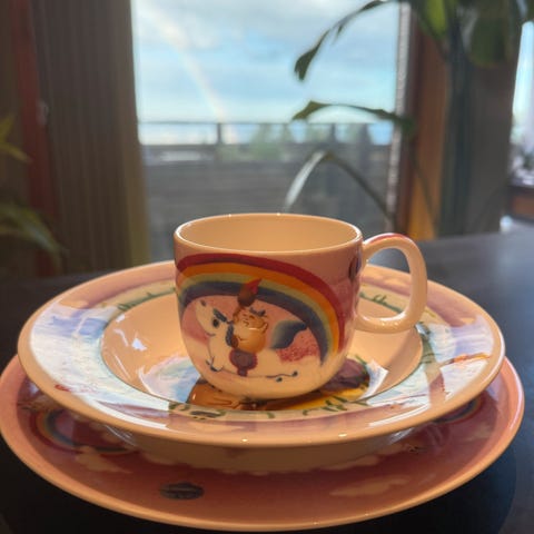 Pent barnesett i 3 deler fra Villeroy & Boch. Se bilder. Asjett 21,5 cm og grøtskål 19,5. Kopp er 7 cm høy. Alt selges for 180,,- Sender post. Har mer barneservise ute.