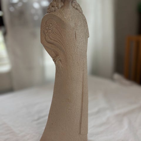 30 cm høy. Keramisk byste skulptur laget av hvitt materiale. Viser en detaljert fremstilling av et ansikt med hår og klær. Egnet som dekorativ gjenstand til innendørs bruk.