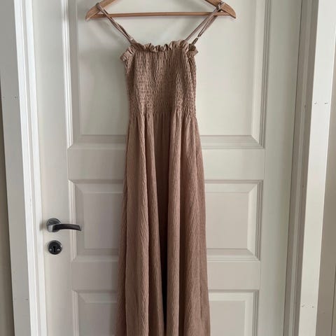 Cream sommerkjole i størrelse XS, beige farge. Kjolen har en kombinasjon av stoff og heklet materiale, med korte ermer og lommer foran. Egnet for kvinner.
