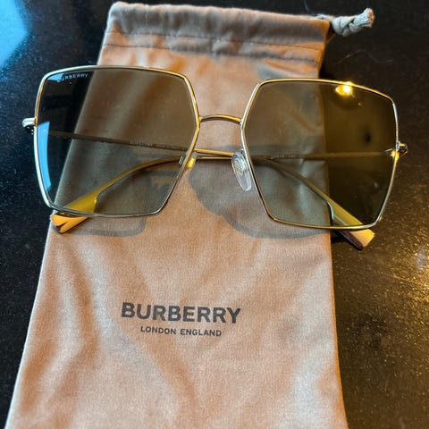 Gucci solbriller for unisex med gullfarget metallramme og rosa linser. Brillene inkluderer et etui for oppbevaring.