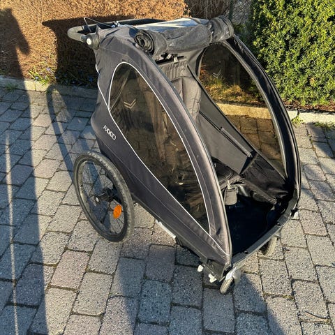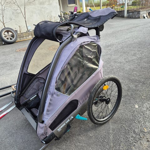 Coaster XT sykkelvogn for 2 barn kjøpt våren 2024, mens ny «body», altså hele trekket på vogna, ble bytta våren 2025 og fremstår dermed som ny.